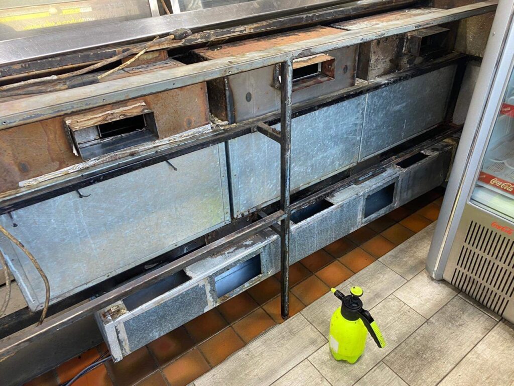 Part of the insurance warranties when operating a fish and chip shop is to get the extraction ducting cleaner annually. This is even more important with this shop being closed for over a year as we could have nesting birds in there.